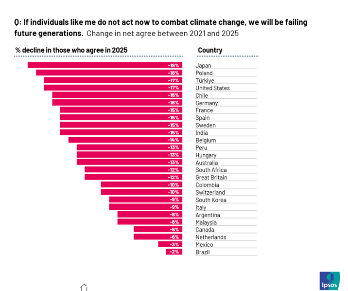 The report, based on a 32-country survey by global research firm Ipsos, shows that concern about climate change in India has dropped by 13 percentage points — from 78% in 2022 to 64% in 2025. More alarming is the decline in the sense of urgency to act, which has fallen 15 points, from 69% in 2021 to just 54% in 2025.